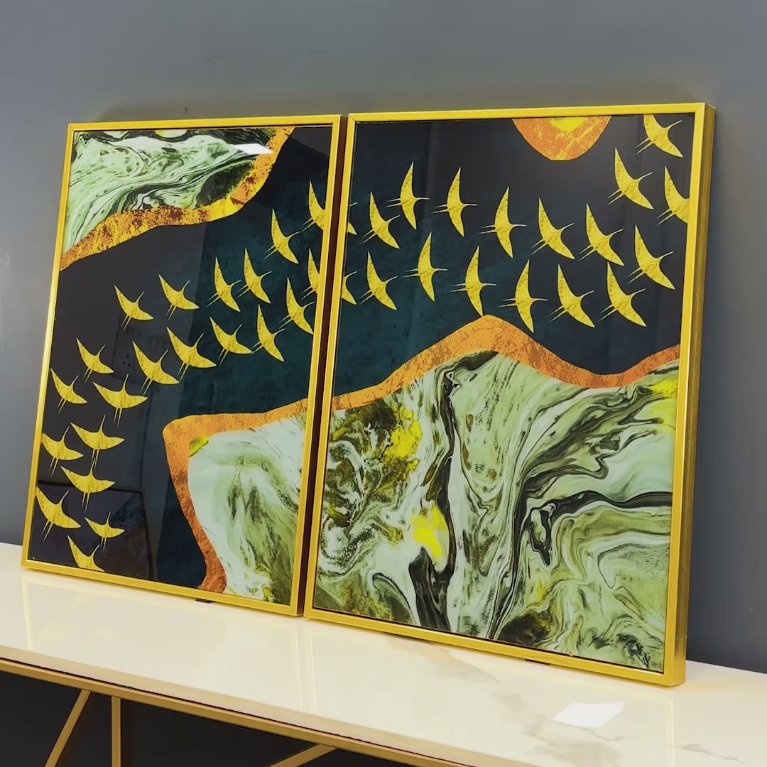 A Flock of Golden Birds Acrylic Floating Wall Painting Set of 2