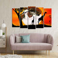 A Pair of Giraffe under a Tree in Sunset Canvas Wall Painting of Five Pieces
