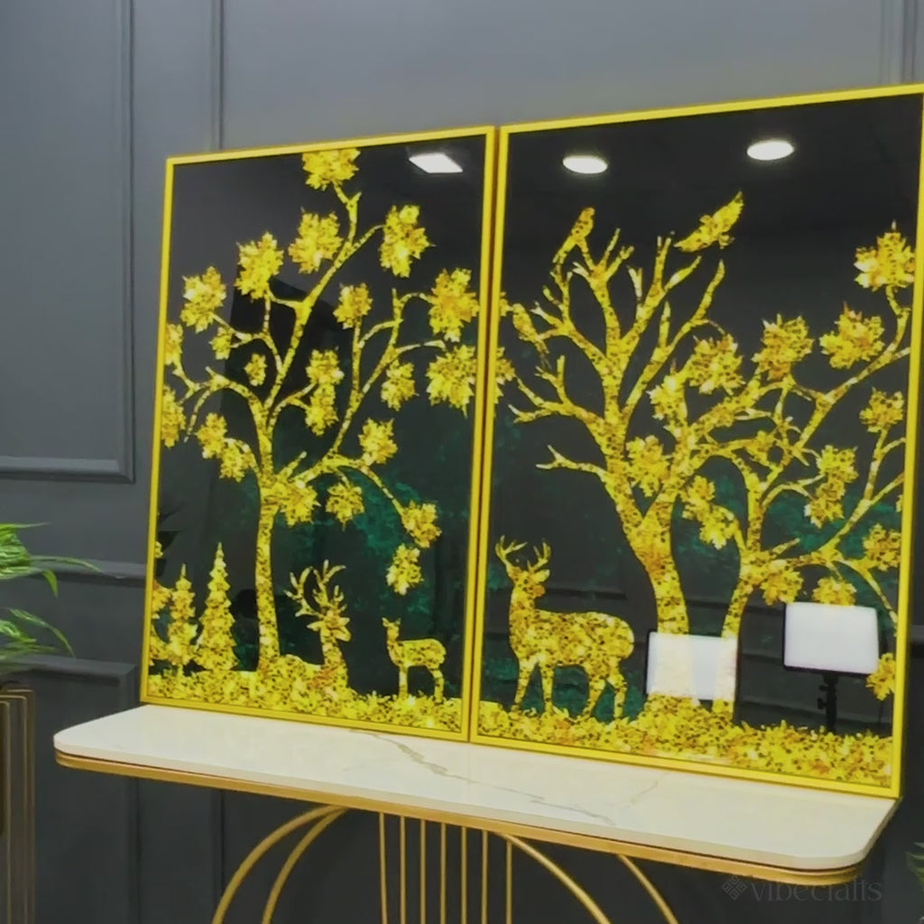 Beautiful Golden Trees with Deer Premium Acrylic Floating Wall Painting Set Of 2