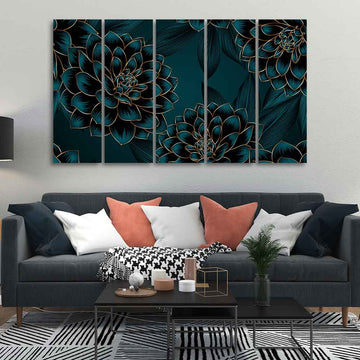 Golden Flowers Dahlia and Leaves Wall Painting of Five Pieces