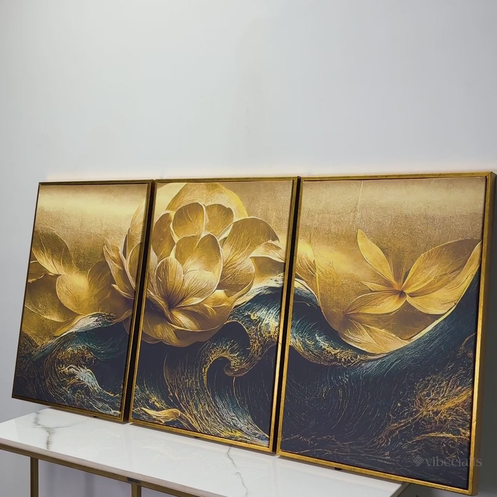 Modern Golden Flower and Waves Floating Canvas Wall Painting Set of Three