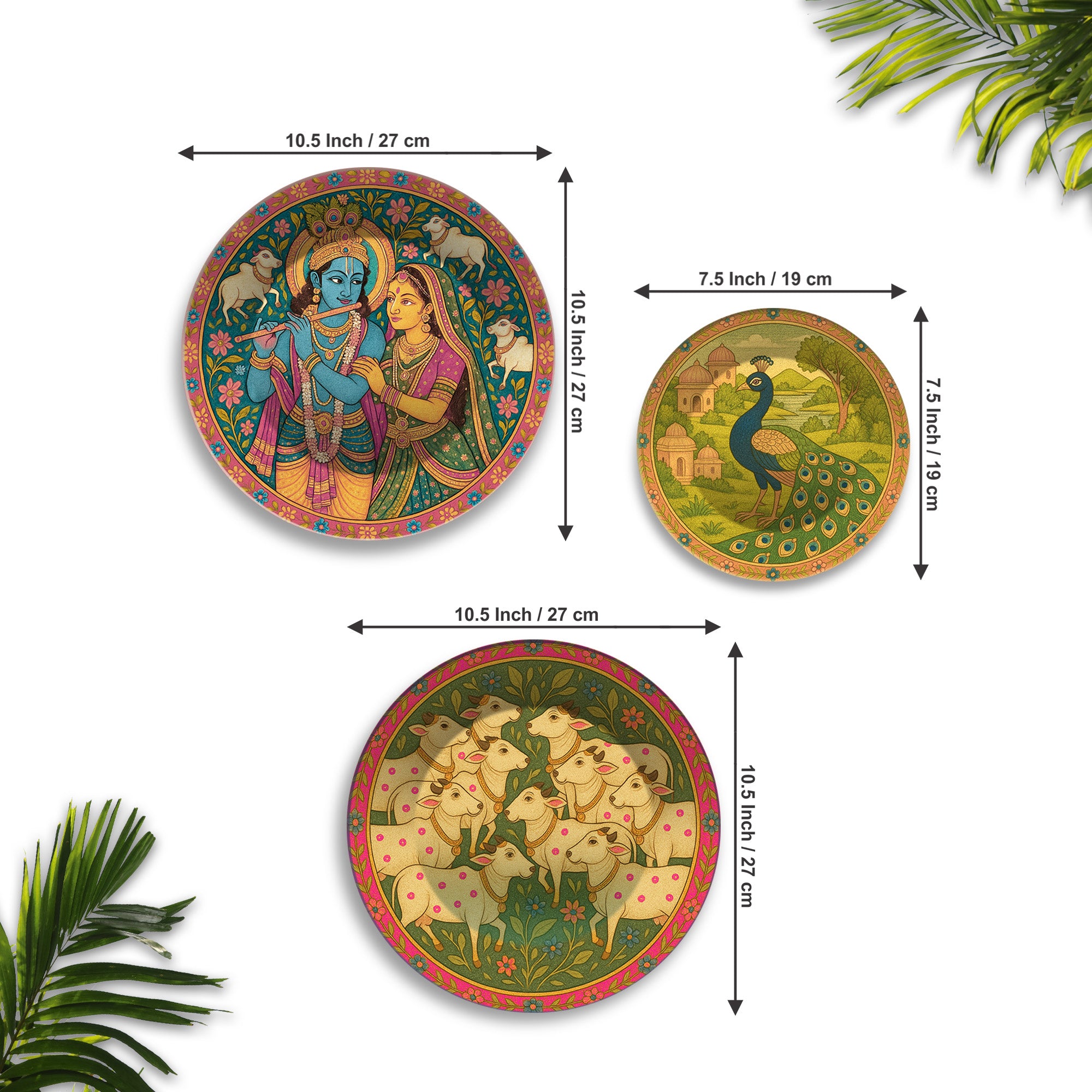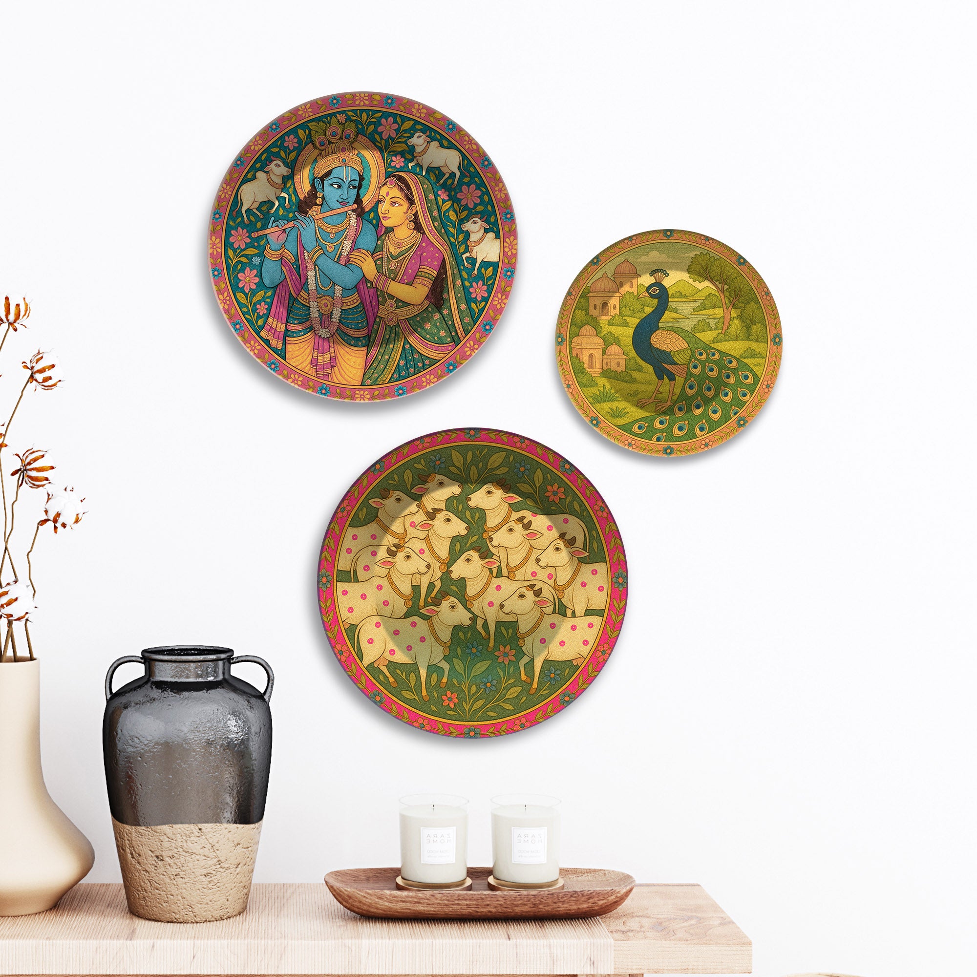 Pichwai Krishna Peacock & Cows Premium Wall Plates Painting Set of 3