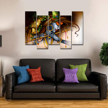 Spiritual 5 Pieces Premium Wall Painting of Lord Krishna Playing Bansuri